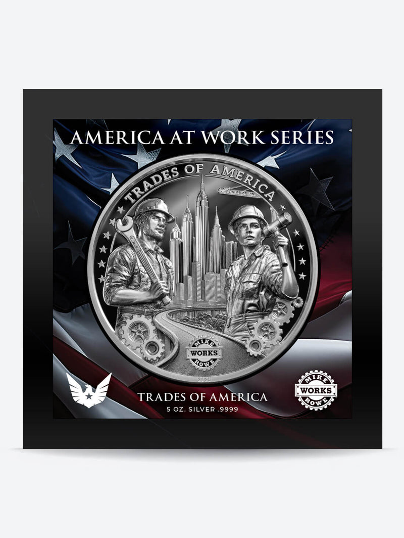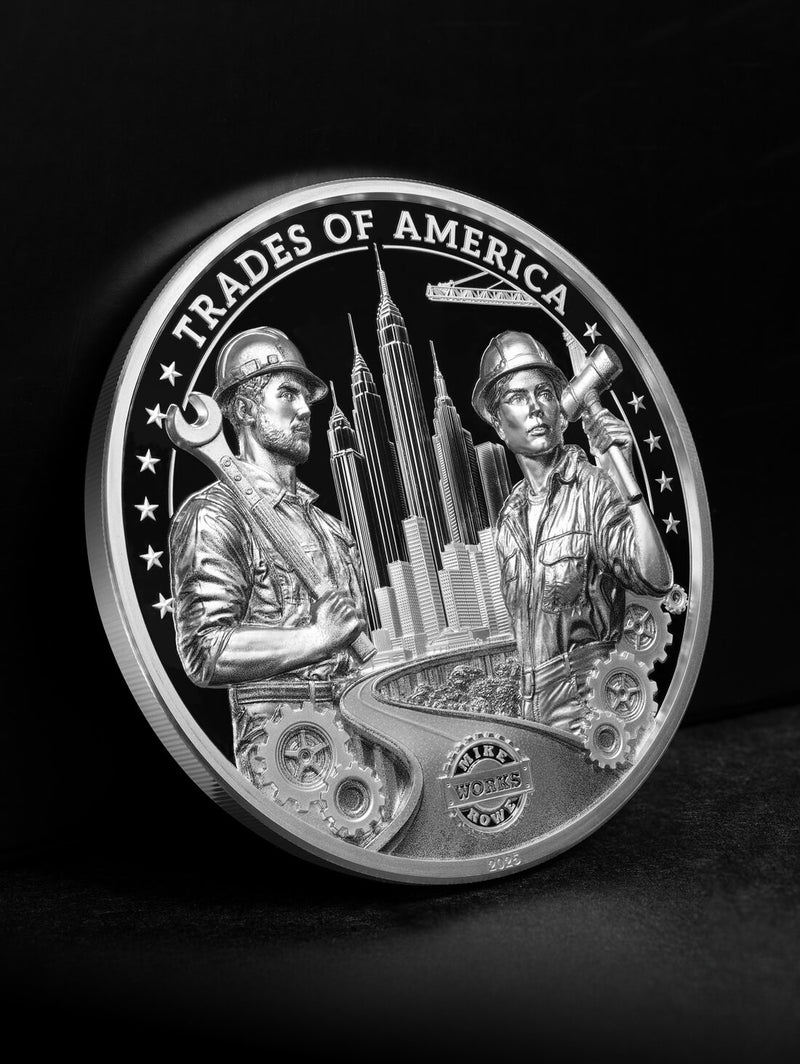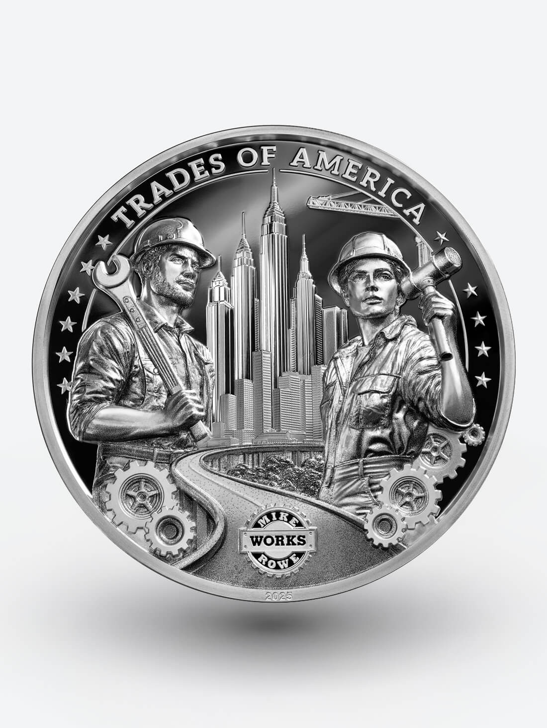 The Trades of America coin pays tribute to the men and women whose hands, tools, and talent built this nation, keep it running, and continue to shape its future. It celebrates the enduring strength of America’s skilled labor force—workers whose grit powers our progress, preserves our greatness, and reminds us what truly makes this country strong.